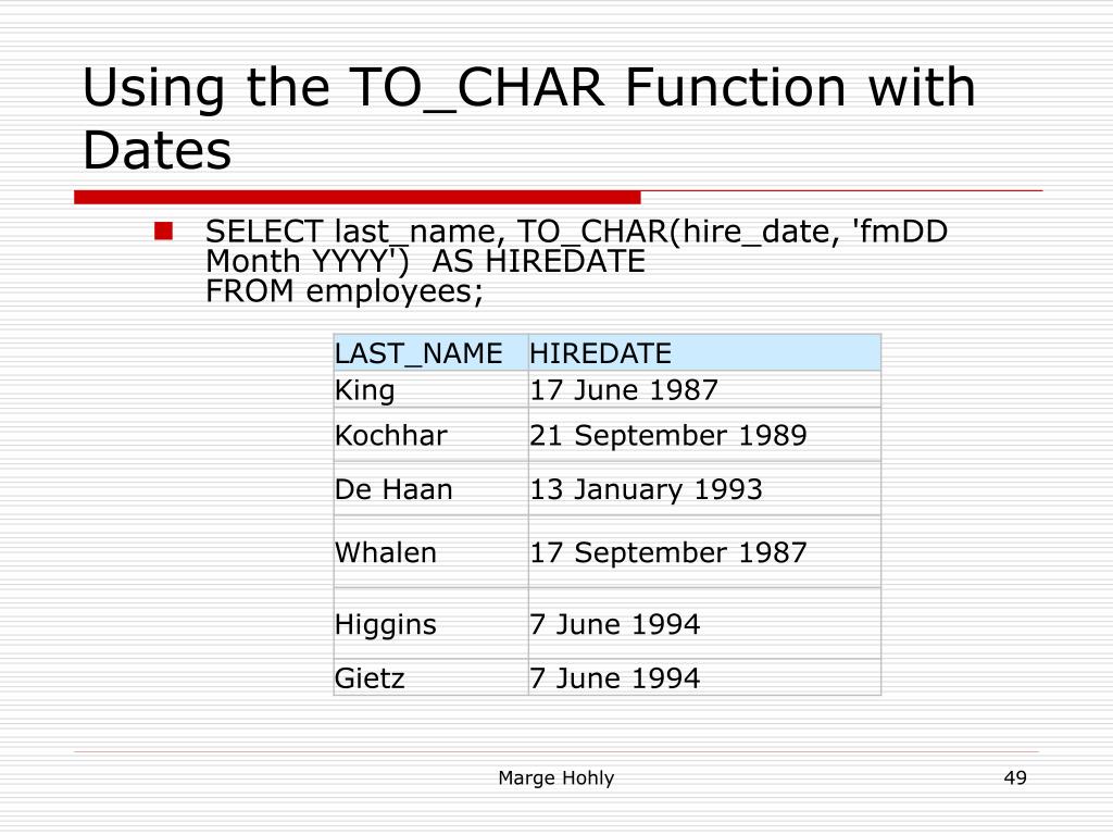 Using the TO_CHAR Function with Dates • SELECT last_name, TO_CHAR(hire_date, 'fmDD Month YYYY') AS HIREDATEFROM employees; Marge Hohly