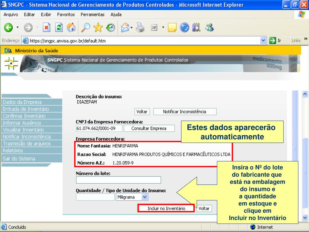 Estes dados aparecerão automaticamente Insira o Nº do lote que está na embalagem do medicamento e a quantidade de caixas em estoque e clique em Incluir no Inventário