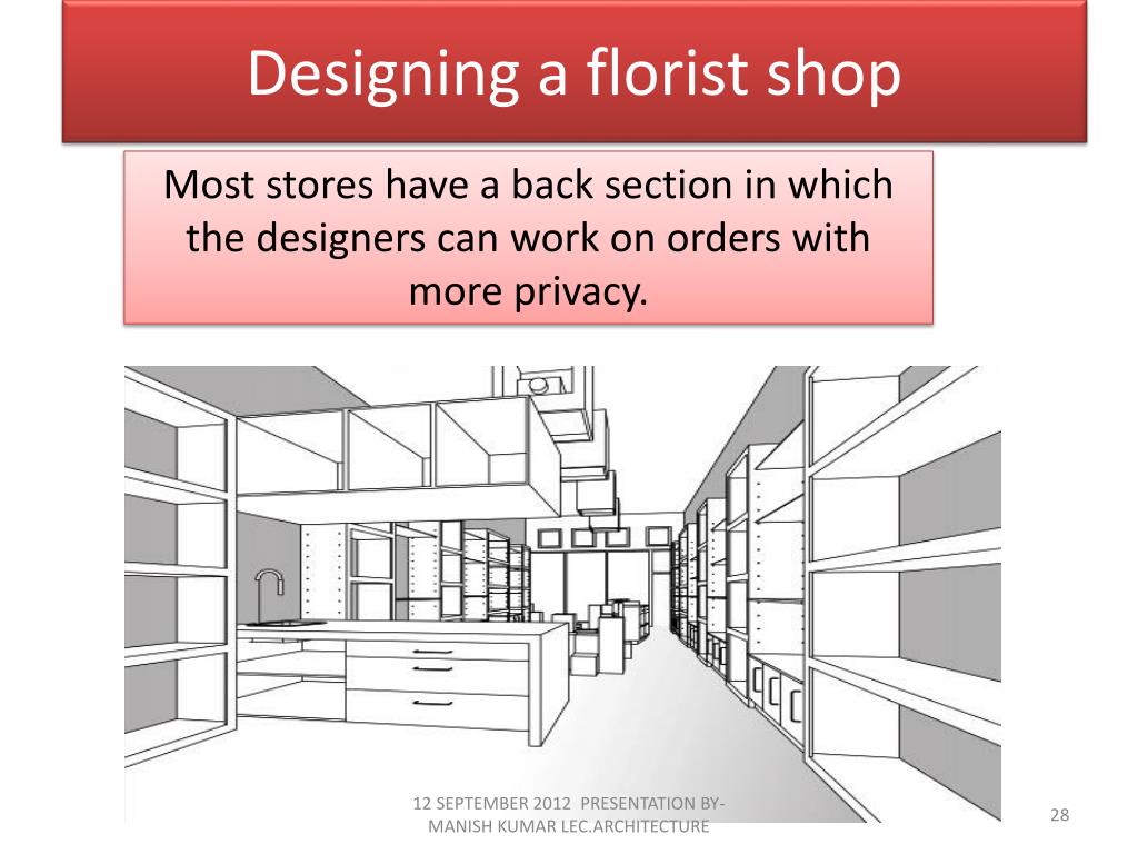 Designing a florist shop Most stores have a back section in which the designers can work on orders with more privacy. 12 SEPTEMBER 2012 PRESENTATION BY-MANISH KUMAR LEC.ARCHITECTURE