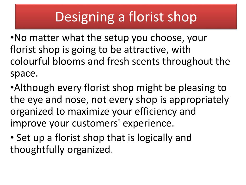 Designing a florist shop No matter what the setup you choose, your florist shop is going to be attractive, with colourful blooms and fresh scents throughout the space. Although every florist shop might be pleasing to the eye and nose, not every shop is appropriately organized to maximize your efficiency and improve your customers' experience. Set up a florist shop that is logically and thoughtfully organized.