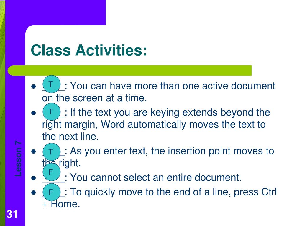 Class Activities: T • ____: You can have more than one active document on the screen at a time. • ____: If the text you are keying extends beyond the right margin, Word automatically moves the text to the next line. • ____: As you enter text, the insertion point moves to the right. • ____: You cannot select an entire document. • ____: To quickly move to the end of a line, press Ctrl + Home. T T F F