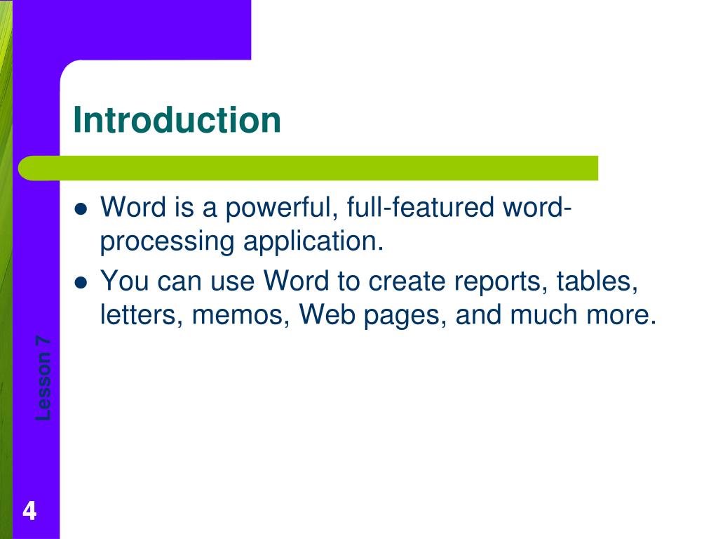 Introduction • Word is a powerful, full-featured word-processing application. • You can use Word to create reports, tables, letters, memos, Web pages, and much more. 4 4