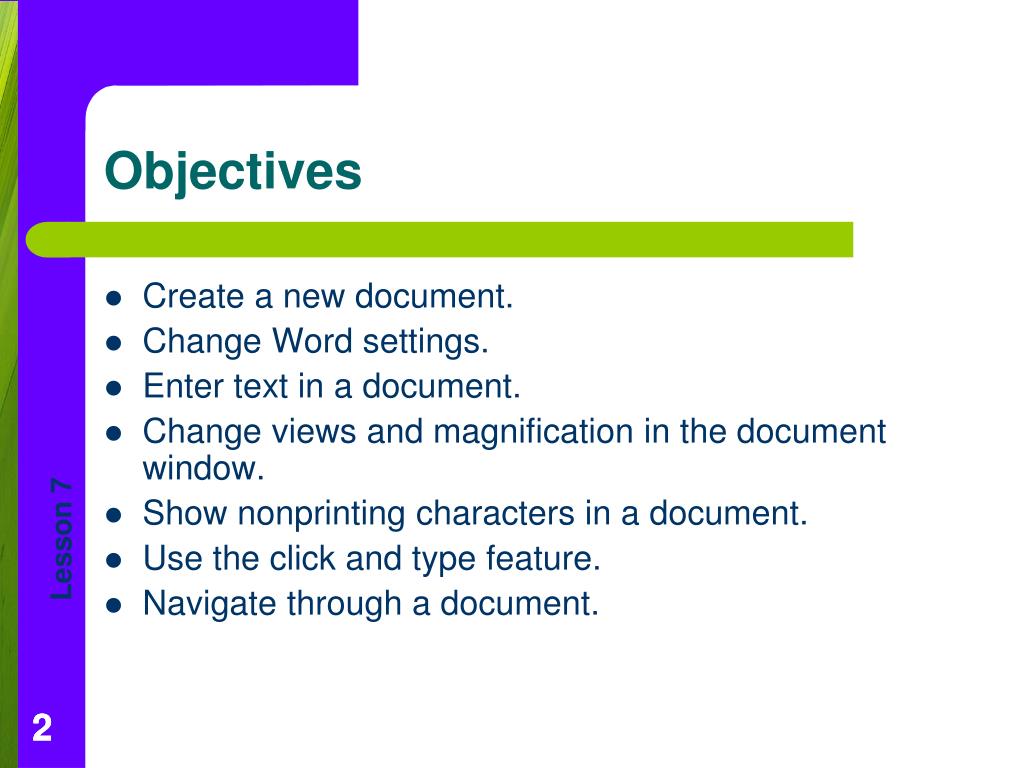 Objectives • Create a new document. • Change Word settings. • Enter text in a document. • Change views and magnification in the document window. • Show nonprinting characters in a document. • Use the click and type feature. • Navigate through a document. 2 2