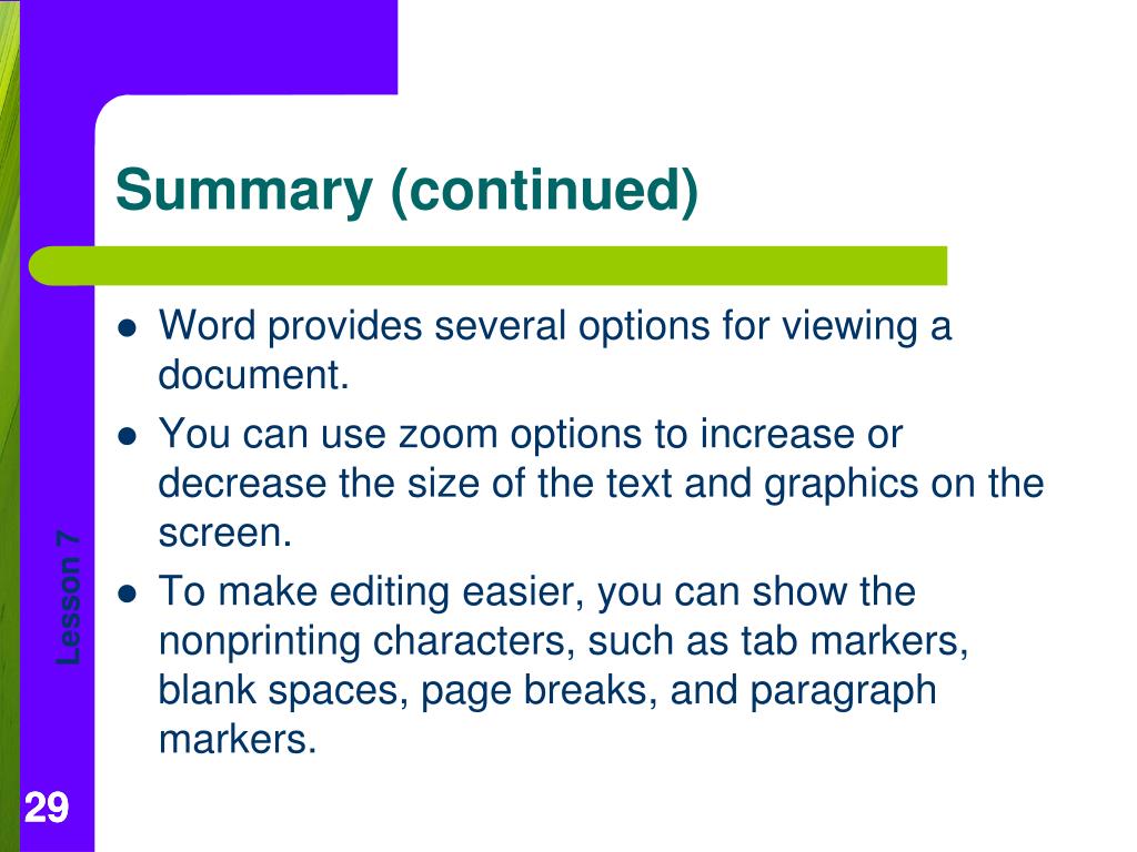 Summary (continued) • Word provides several options for viewing a document. • You can use zoom options to increase or decrease the size of the text and graphics on the screen. • To make editing easier, you can show the nonprinting characters, such as tab markers, blank spaces, page breaks, and paragraph markers. 29 29