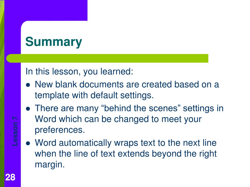 Summary In this lesson, you learned: • New blank documents are created based on a template with default settings. • There are many “behind the scenes” settings in Word which can be changed to meet your preferences. • Word automatically wraps text to the next line when the line of text extends beyond the right margin. 28 28