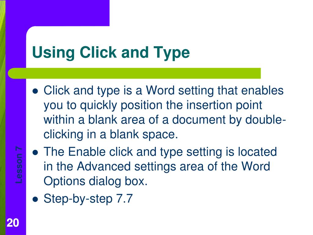 Click and type is a Word setting that enables you to quickly position the insertion point within a blank area of a document by double-clicking in a blank space. The Enable click and type setting is located in the Advanced settings area of the Word Options dialog box. Step-by-step 7.7 Using Click and Type 20 20