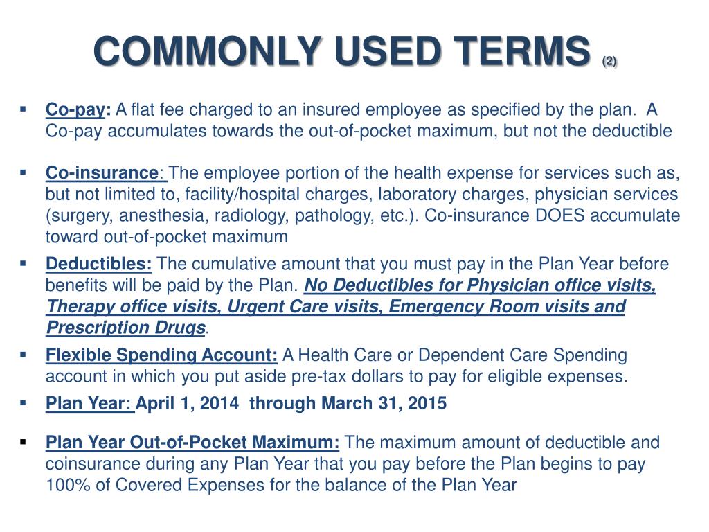 COMMONLY USED TERMS (2) • Co-pay: A flat fee charged to an insured employee as specified by the plan. A Co-pay accumulates towards the out-of-pocket maximum, but not the deductible • Co-insurance: The employee portion of the health expense for services such as, but not limited to, facility/hospital charges, laboratory charges, physician services (surgery, anesthesia, radiology, pathology, etc.). Co-insurance DOES accumulate toward out-of-pocket maximum • Deductibles: The cumulative amount that you must pay in the Plan Year before benefits will be paid by the Plan. No Deductibles for Physician office visits, Therapy office visits, Urgent Care visits, Emergency Room visits and Prescription Drugs. • Flexible Spending Account: A Health Care or Dependent Care Spending account in which you put aside pre-tax dollars to pay for eligible expenses. • Plan Year: April 1, 2014 through March 31, 2015 • Plan Year Out-of-Pocket Maximum: The maximum amount of deductible and coinsurance during any Plan Year that you pay before the Plan begins to pay 100% of Covered Expenses for the balance of the Plan Year