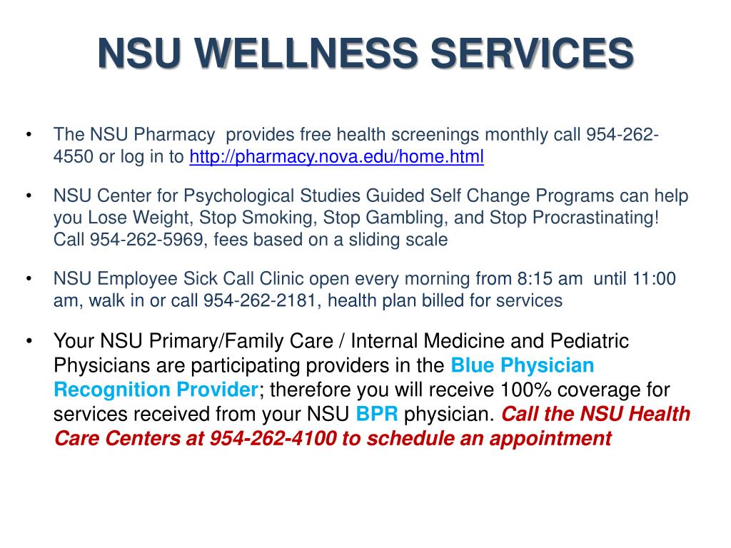NSU WELLNESS SERVICES • The NSU Pharmacy provides free health screenings monthly call 954-262-4550 or log in to http://pharmacy.nova.edu/home.html • NSU Center for Psychological Studies Guided Self Change Programs can help you Lose Weight, Stop Smoking, Stop Gambling, and Stop Procrastinating! Call 954-262-5969, fees based on a sliding scale • NSU Employee Sick Call Clinic open every morning from 8:15 am until 11:00 am, walk in or call 954-262-2181, health plan billed for services • Your NSU Primary/Family Care / Internal Medicine and Pediatric Physicians are participating providers in the Blue Physician Recognition Provider; therefore you will receive 100% coverage for services received from your NSU BPRphysician. Call the NSU Health Care Centers at 954-262-4100 to schedule an appointment