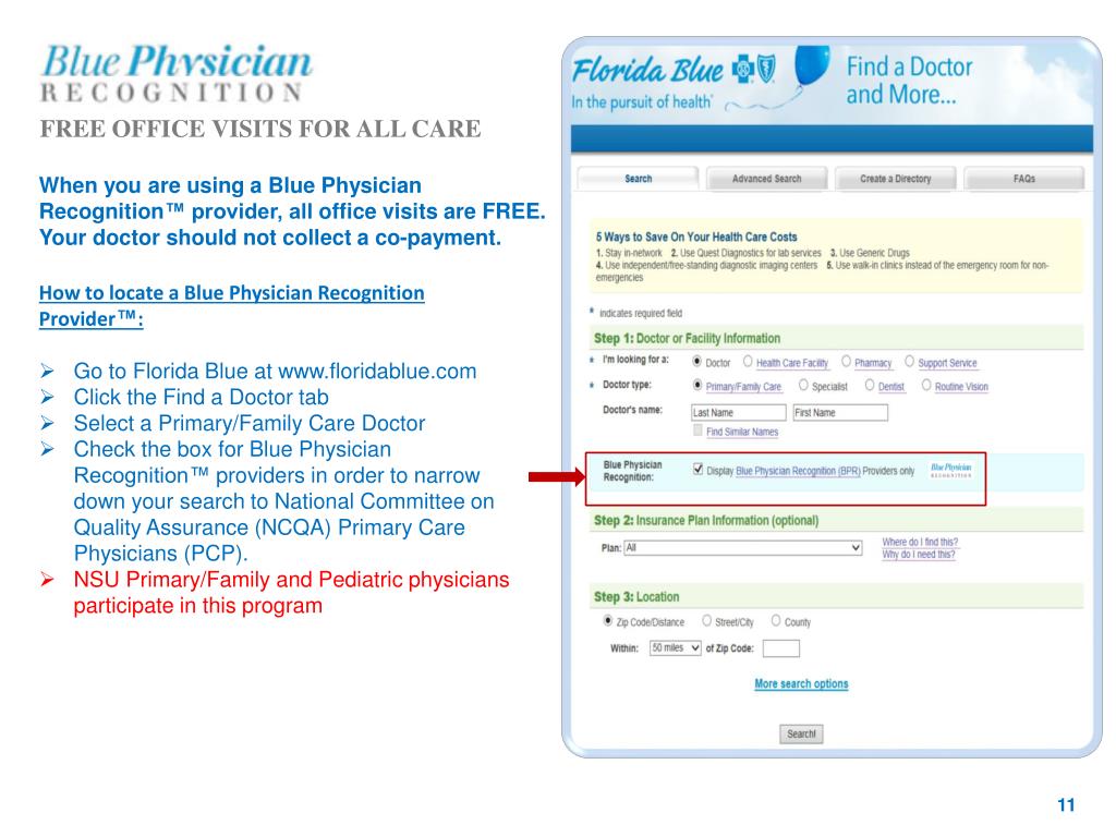3 When you are using a Blue Physician Recognition™ provider, all office visits are FREE. Your doctor should not collect a co-payment. FREE OFFICE VISITS FOR ALL CARE • How to locate a Blue Physician Recognition Provider™: • Go to Florida Blue at www.floridablue.com • Click the Find a Doctor tab • Select a Primary/Family Care Doctor • Check the box for Blue Physician Recognition™ providers in order to narrow down your search to National Committee on Quality Assurance (NCQA) Primary Care Physicians (PCP). • NSUPrimary/Family and Pediatric physicians participate in this program