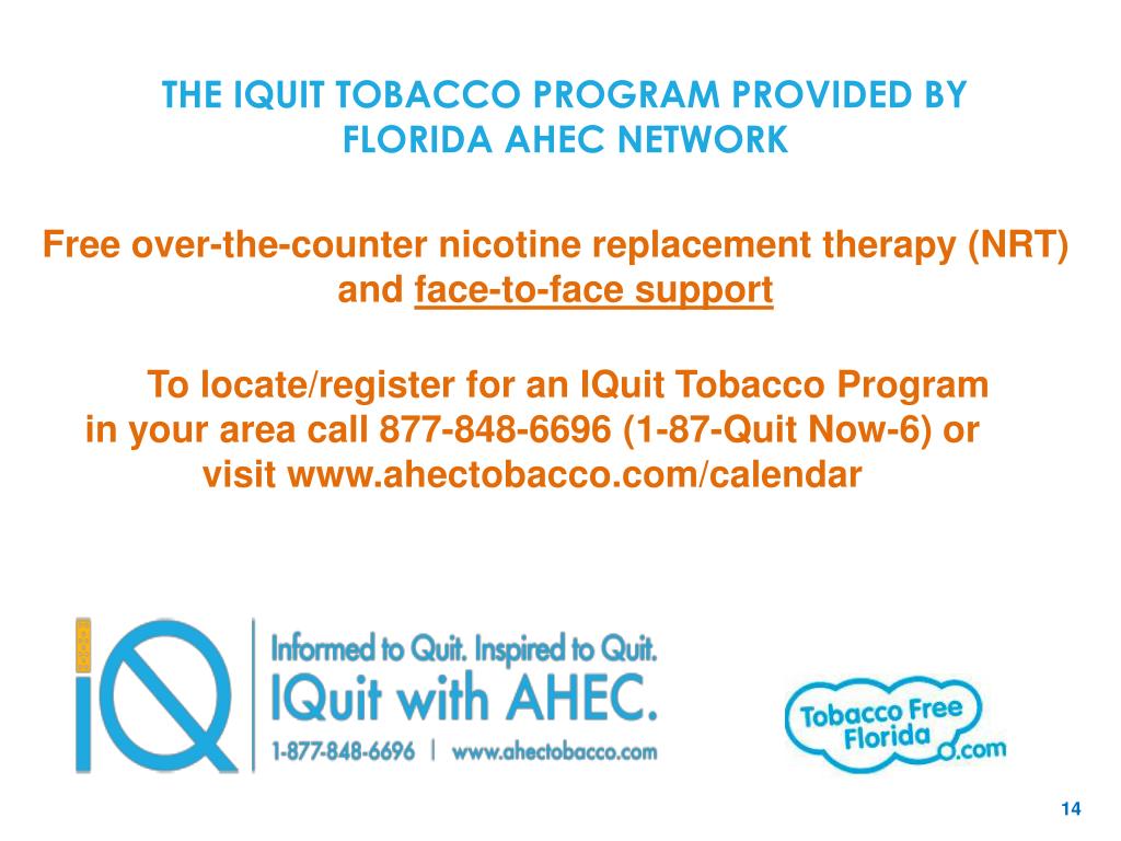 THE IQUIT TOBACCO PROGRAM PROVIDED BY FLORIDA AHEC NETWORK Free over-the-counter nicotine replacement therapy (NRT) and face-to-face support To locate/register for an IQuit Tobacco Program in your area call 877-848-6696 (1-87-Quit Now-6) or visit www.ahectobacco.com/calendar