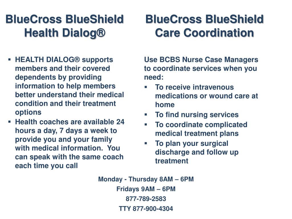 BlueCross BlueShield Health Dialog® BlueCross BlueShield Care Coordination • HEALTH DIALOG® supports members and their covered dependents by providing information to help members better understand their medical condition and their treatment options • Health coaches are available 24 hours a day, 7 days a week to provide you and your family with medical information. You can speak with the same coach each time you call • Use BCBS Nurse Case Managers to coordinate services when you need: • To receive intravenous medications or wound care at home • To find nursing services • To coordinate complicated medical treatment plans • To plan your surgical discharge and follow up treatment Monday - Thursday 8AM – 6PM Fridays 9AM – 6PM 877-789-2583 TTY 877-900-4304