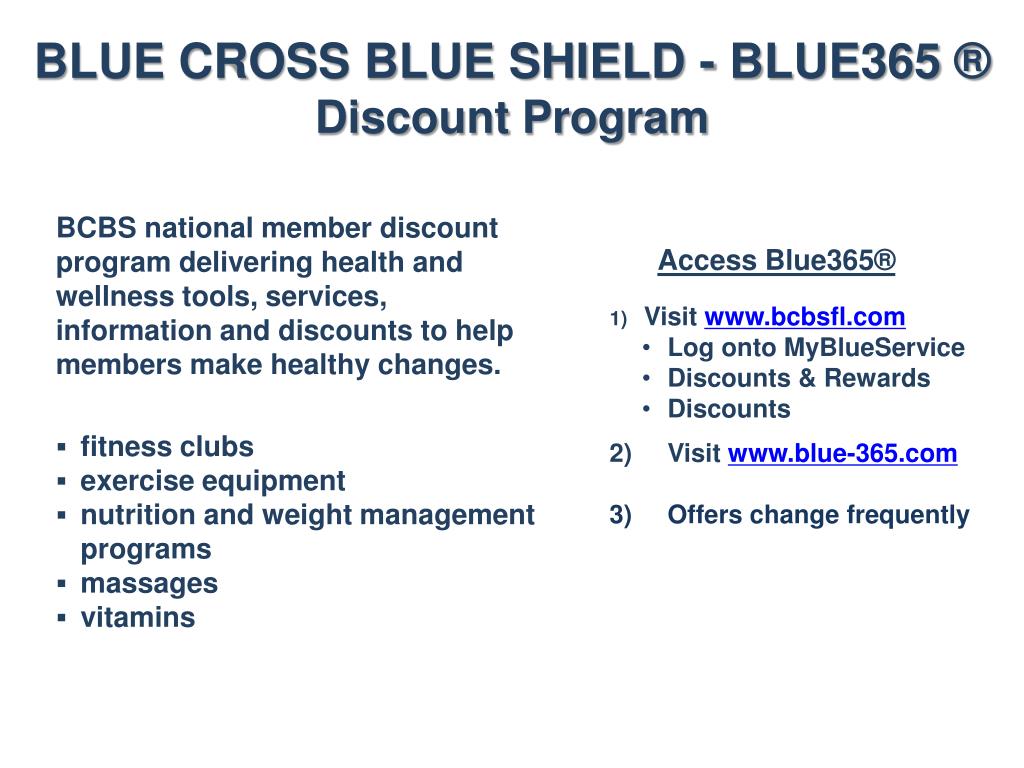 BLUE CROSS BLUE SHIELD - BLUE365 ® Discount Program • BCBS national member discount program delivering health and wellness tools, services, information and discounts to help members make healthy changes. • fitness clubs • exercise equipment • nutrition and weight management programs • massages • vitamins • Access Blue365® • 1) Visit www.bcbsfl.com • Log onto MyBlueService • Discounts & Rewards • Discounts • Visit www.blue-365.com • Offers change frequently