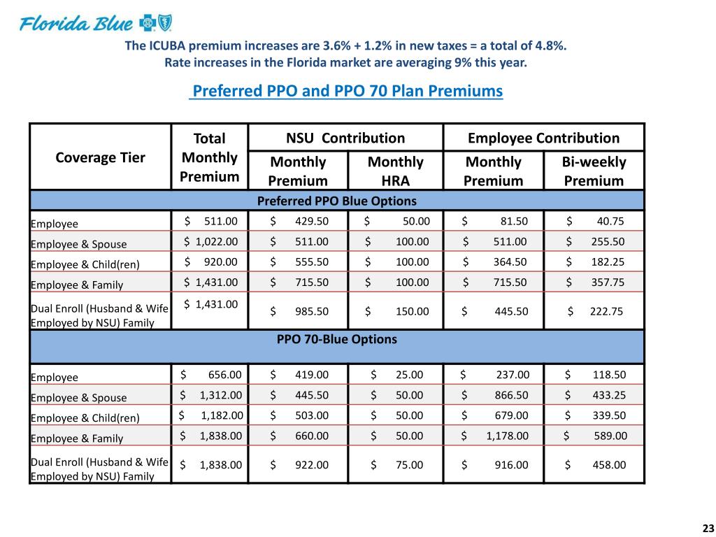 The ICUBA premium increases are 3.6% + 1.2% in new taxes = a total of 4.8%.Rate increases in the Florida market are averaging 9% this year. Preferred PPO and PPO 70 Plan Premiums