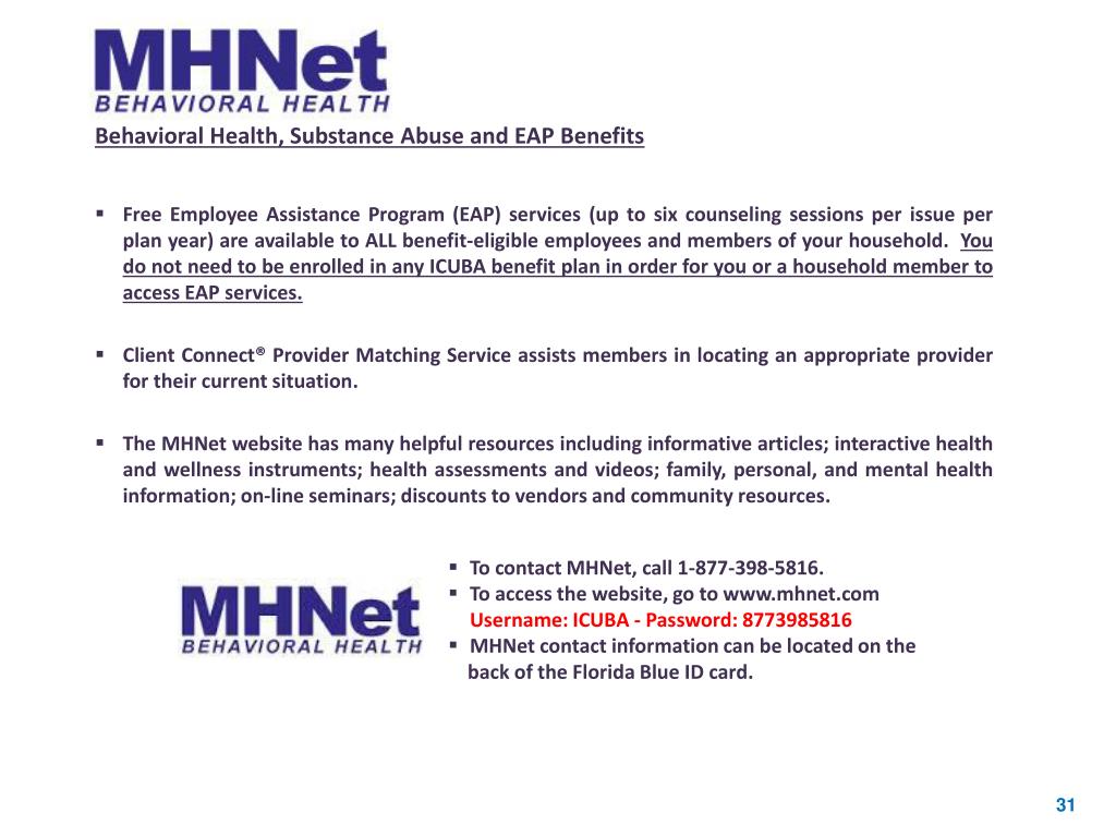 Behavioral Health, Substance Abuse and EAP Benefits • Free Employee Assistance Program (EAP) services (up to six counseling sessions per issue per plan year) are available to ALL benefit-eligible employees and members of your household. You do not need to be enrolled in any ICUBA benefit plan in order for you or a household member to access EAP services. • Client Connect® Provider Matching Service assists members in locating an appropriate provider for their current situation. • The MHNet website has many helpful resources including informative articles; interactive health and wellness instruments; health assessments and videos; family, personal, and mental health information; on-line seminars; discounts to vendors and community resources. • To contact MHNet, call 1-877-398-5816. • To access the website, go to www.mhnet.com Username: ICUBA - Password: 8773985816 • MHNet contact information can be located on the back of the Florida Blue ID card.