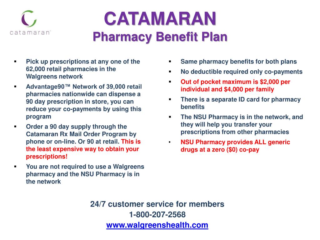 CATAMARAN Pharmacy Benefit Plan • Pick up prescriptions at any one of the 62,000 retail pharmacies in the Walgreens network • Advantage90™ Network of 39,000 retail pharmacies nationwide can dispense a 90 day prescription in store, you can reduce your co-payments by using this program • Order a 90 day supply through the Catamaran Rx Mail Order Program by phone or on-line. Or 90 at retail. This is the least expensive way to obtain your prescriptions! • You are not required to use a Walgreens pharmacy and the NSU Pharmacy is in the network • Same pharmacy benefits for both plans • No deductible required only co-payments • Out of pocket maximum is $2,000 per individual and $4,000 per family • There is a separate ID card for pharmacy benefits • The NSU Pharmacy is in the network, and they will help you transfer your prescriptions from other pharmacies • NSU Pharmacy provides ALL generic drugs at a zero ($0) co-pay • 24/7 customer service for members • 1-800-207-2568 • www.walgreenshealth.com