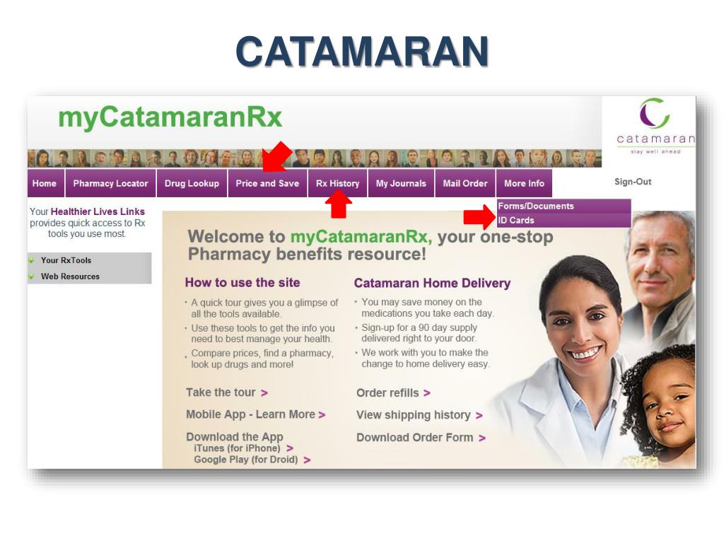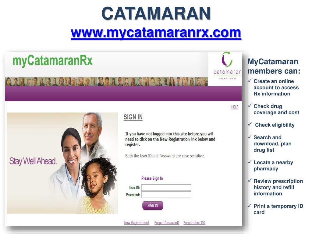 CATAMARAN www.mycatamaranrx.com • MyCatamaranmembers can: • Create an online account to access Rx information • Check drug coverage and cost • Check eligibility • Search and download, plan drug list • Locate a nearby pharmacy • Review prescription history and refill information • Print a temporary ID card