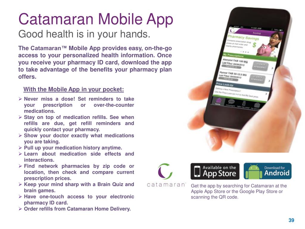 Catamaran Mobile App Good health is in your hands. The Catamaran™ Mobile App provides easy, on-the-go access to your personalized health information. Once you receive your pharmacy ID card, download the app to take advantage of the benefits your pharmacy plan offers. With the Mobile App in your pocket: • Never miss a dose! Set reminders to take your prescription or over-the-counter medications. • Stay on top of medication refills. See when refills are due, get refill reminders and quickly contact your pharmacy. • Show your doctor exactly what medications you are taking. • Pull up your medication history anytime. • Learn about medication side effects and interactions. • Find network pharmacies by zip code or location, then check and compare current prescription prices. • Keep your mind sharp with a Brain Quiz and brain games. • Have one-touch access to your electronic pharmacy ID card. • Order refills from Catamaran Home Delivery. Get the app by searching for Catamaran at the Apple App Store or the Google Play Store or scanning the QR code.