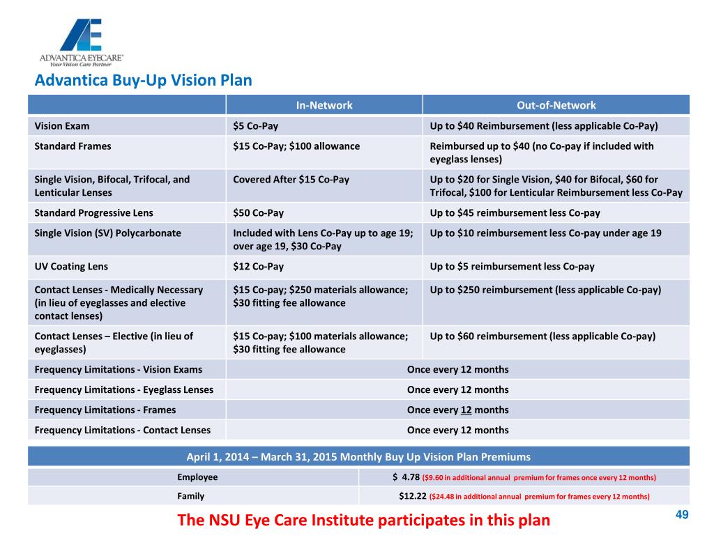 The NSU Eye Care Institute participates in this plan Advantica Base Vision Plan