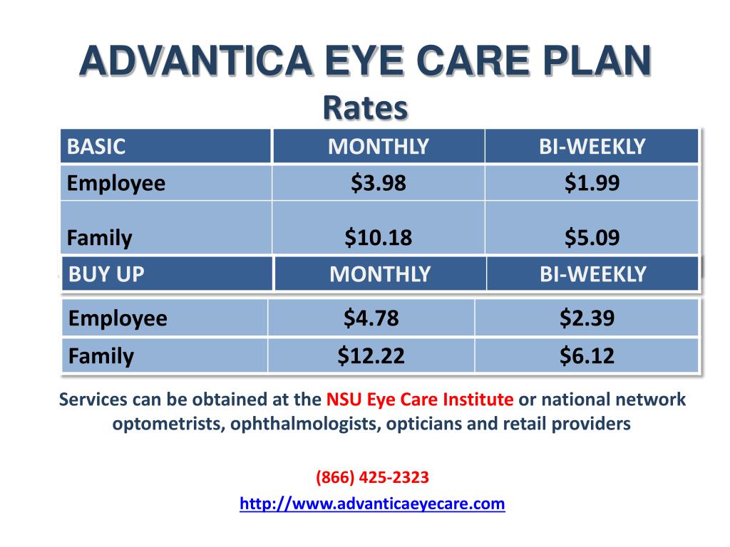 ADVANTICA EYE CARE PLAN Rates Services can be obtained at the NSU Eye Care Institute or national network optometrists, ophthalmologists, opticians and retail providers (866) 425-2323 http://www.advanticaeyecare.com