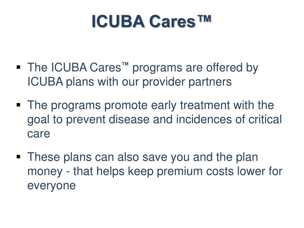 ICUBA Cares™ • The ICUBA Cares™ programs are offered by ICUBA plans with our provider partners • The programs promote early treatment with the goal to prevent disease and incidences of critical care • These plans can also save you and the plan money - that helps keep premium costs lower for everyone