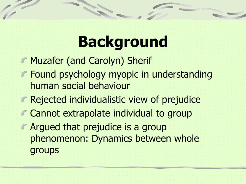 Background • Muzafer (and Carolyn) Sherif • Found psychology myopic in understanding human social behaviour • Rejected individualistic view of prejudice • Cannot extrapolate individual to group • Argued that prejudice is a group phenomenon: Dynamics between whole groups