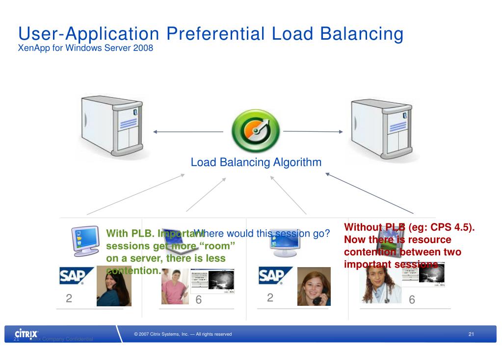 User-Application Preferential Load BalancingXenApp for Windows Server 2008 Load Balancing Algorithm Without PLB (eg: CPS 4.5). Now there is resource contention between two important sessions Where would this session go? With PLB. Important sessions get more “room” on a server, there is less contention. 2 2 6 6 21 Citrix Company Confidential