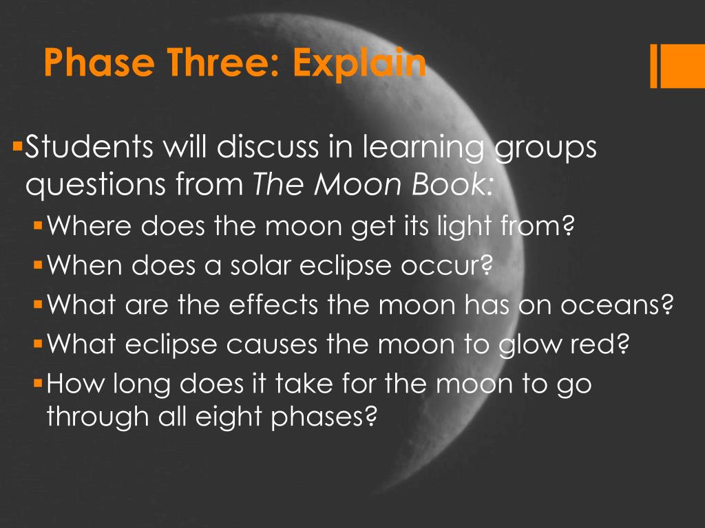 Phase Three: Explain • Students will discuss in learning groups questions from The Moon Book: • Where does the moon get its light from? • When does a solar eclipse occur? • What are the effects the moon has on oceans? • What eclipse causes the moon to glow red? • How long does it take for the moon to go through all eight phases?