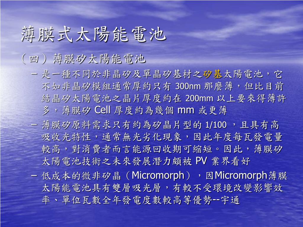 薄膜式太陽能電池 (四)薄膜矽太陽能電池 • 是一種不同於非晶矽及單晶矽基材之矽基太陽電池,它不如非晶矽模組通常厚約只有 300nm 那麼薄,但比目前結晶矽太陽電池之晶片厚度約在 200mm 以上要來得薄許多,薄膜矽 Cell 厚度約為幾個 mm 或更薄 • 薄膜矽原料需求只有約為矽晶片型的1/100 ,且具有高吸收光特性,通常無光劣化現象,因此年度每瓦發電量較高,對消費者而言能源回收期可縮短。因此,薄膜矽太陽電池技術之未來發展潛力頗被 PV 業界看好 • 低成本的微非矽晶(Micromorph),因Micromorph薄膜太陽能電池具有雙層吸光層,有較不受環境改變影響效率、單位瓦數全年發電度數較高等優勢--宇通