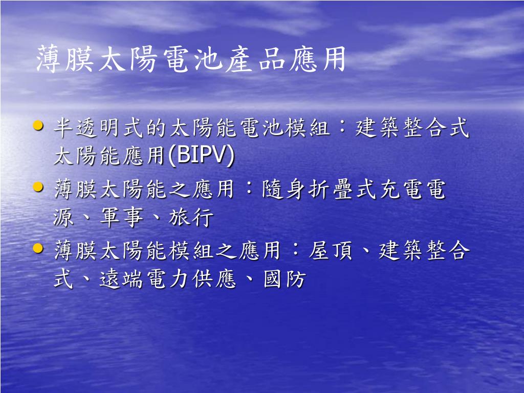 薄膜太陽電池產品應用 • 半透明式的太陽能電池模組:建築整合式太陽能應用(BIPV) • 薄膜太陽能之應用:隨身折疊式充電電源、軍事、旅行 • 薄膜太陽能模組之應用:屋頂、建築整合式、遠端電力供應、國防