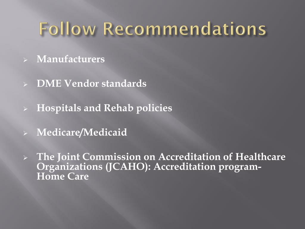 Follow Recommendations • Manufacturers • DME Vendor standards • Hospitals and Rehab policies • Medicare/Medicaid • The Joint Commission on Accreditation of Healthcare Organizations (JCAHO): Accreditation program-Home Care