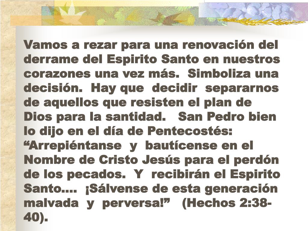 Vamos a rezar para una renovación del derrame del Espirito Santo en nuestros corazones una vez más. Simboliza una decisión. Hay que decidir separarnos de aquellos que resisten el plan de Dios para la santidad. San Pedro bien lo dijo en el día de Pentecostés: “Arrepiéntanse y bautícense en el Nombre de Cristo Jesús para el perdón de los pecados. Y recibirán el Espirito Santo....¡Sálvense de esta generación malvada y perversa!”(Hechos 2:38-40).