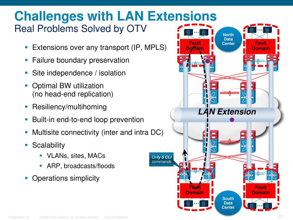 Challenges with LAN ExtensionsReal Problems Solved by OTV North Data Center • Extensions over any transport (IP, MPLS) • Failure boundary preservation • Site independence / isolation • Optimal BW utilization (no head-end replication) • Resiliency/multihoming • Built-in end-to-end loop prevention • Multisite connectivity (inter and intra DC) • Scalability • VLANs, sites, MACs • ARP, broadcasts/floods • Operations simplicity LAN Extension Fault Domain Fault Domain Fault Domain Fault Domain Only 5 CLI commands South Data Center