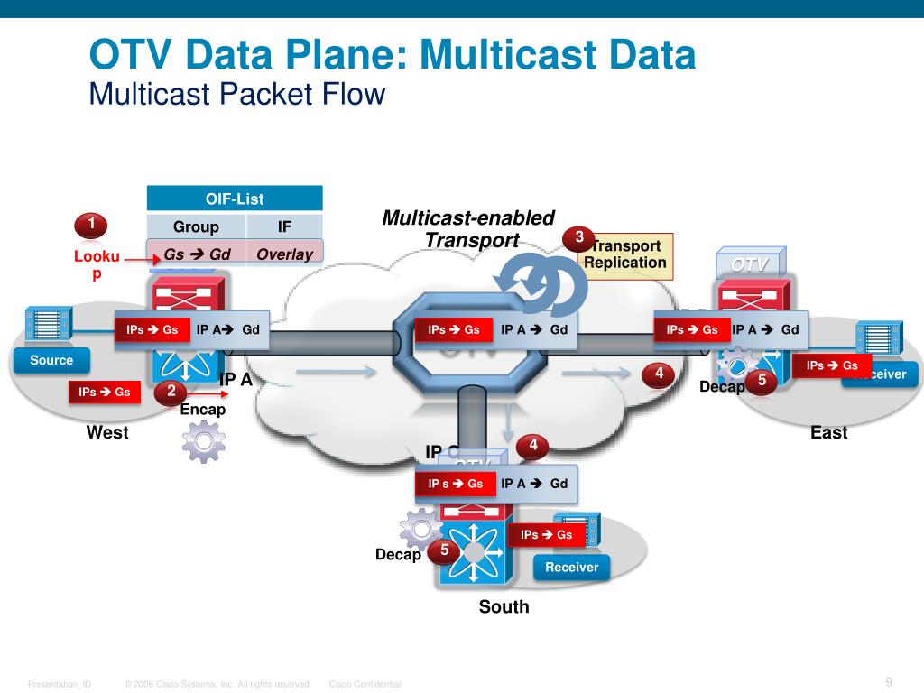 3 4 1 5 5 4 2 OTV Data Plane: Multicast DataMulticast Packet Flow Multicast-enabled Transport OTV OTV OTV Transport Replication IP B Lookup IP A Gd IP A Gd Source IP A Gd IP AGd IP s Gs IPsGs IPsGs IPsGs IPsGs Receiver IP A IPsGs West East IP C OTV IPsGs Receiver Decap South Decap Encap