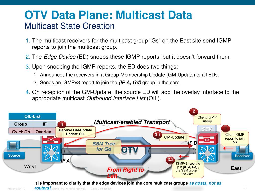 4 3.2 1 2 3.1 OTV Data Plane: Multicast DataMulticast State Creation The multicast receivers for the multicast group “Gs” on the East site send IGMP reports to join the multicast group. The Edge Device (ED) snoops these IGMP reports, but it doesn’t forward them. Upon snooping the IGMP reports, the ED does two things: • Announces the receivers in a Group-Membership Update (GM-Update) to all EDs. • Sends an IGMPv3 report to join the (IP A, Gd) group in the core. On reception of the GM-Update, the source ED will add the overlay interface to the appropriate multicast Outbound Interface List (OIL). SSMTree for Gd Multicast-enabled Transport GM-Update IGMPv3 report to join (IP A, Gd) , the SSM group in the Core. Receive GM-Update Update OIL Client IGMP snoop ClientIGMP report to join Gs OTV OTV OTV IP B Source Receiver IP A West East From Right to Left • It is important to clarify that the edge devices join the core multicast groups as hosts, not as routers!