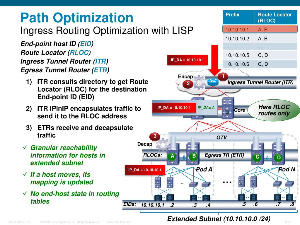 D 1 3 C B A 2 Path OptimizationIngress Routing Optimization with LISP • End-point host ID (EID) • Route Locator (RLOC) • Ingress Tunnel Router (ITR) • Egress Tunnel Router (ETR) • ITR consults directory to get Route Locator (RLOC) for the destination End-point ID (EID) • ITR IPinIP encapsulates traffic to send it to the RLOC address • ETRs receive and decapsulate traffic IP_DA = 10.10.10.1 Ingress Tunnel Router (ITR) Here RLOC routes only Core IP_DA= A IP_DA = 10.10.10.1 OTV • Granular reachability information for hosts in extended subnet • If a host moves, its mapping is updated • No end-host state in routing tables RLOCs: Egress TR (ETR) Pod N IP_DA = 10.10.10.1 Pod A … EIDs: .5 .6 .7 .8 10.10.10.1 .2 .3 .4 Encap Decap Extended Subnet (10.10.10.0 /24)
