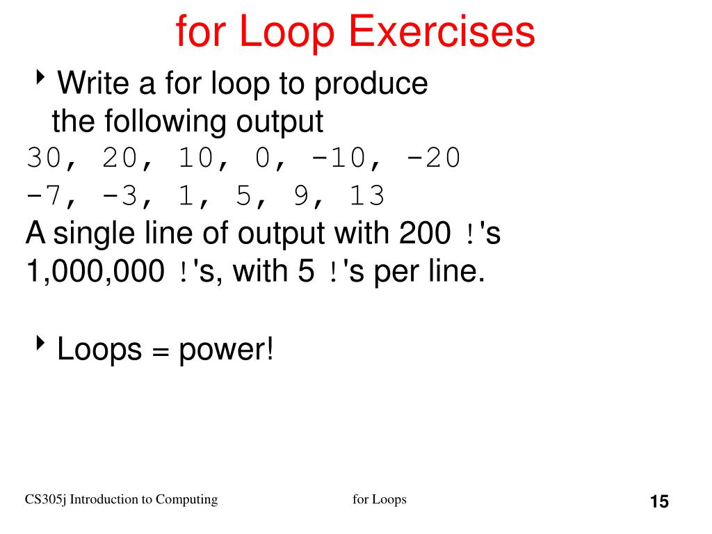 for Loop Exercises • Write a for loop to produce the following output 30, 20, 10, 0, -10, -20 -7, -3, 1, 5, 9, 13 A single line of output with 200 !'s 1,000,000 !'s, with 5 !'s per line. • Loops = power! for Loops