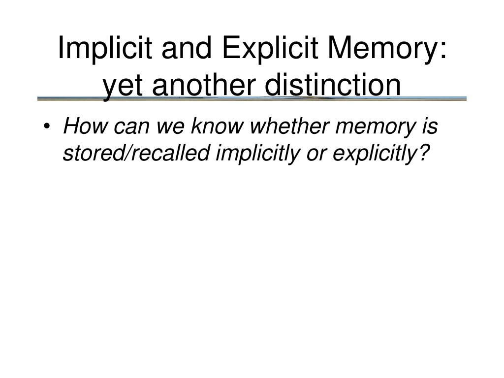 Implicit and Explicit Memory: yet another distinction • How can we know whether memory is stored/recalled implicitly or explicitly?
