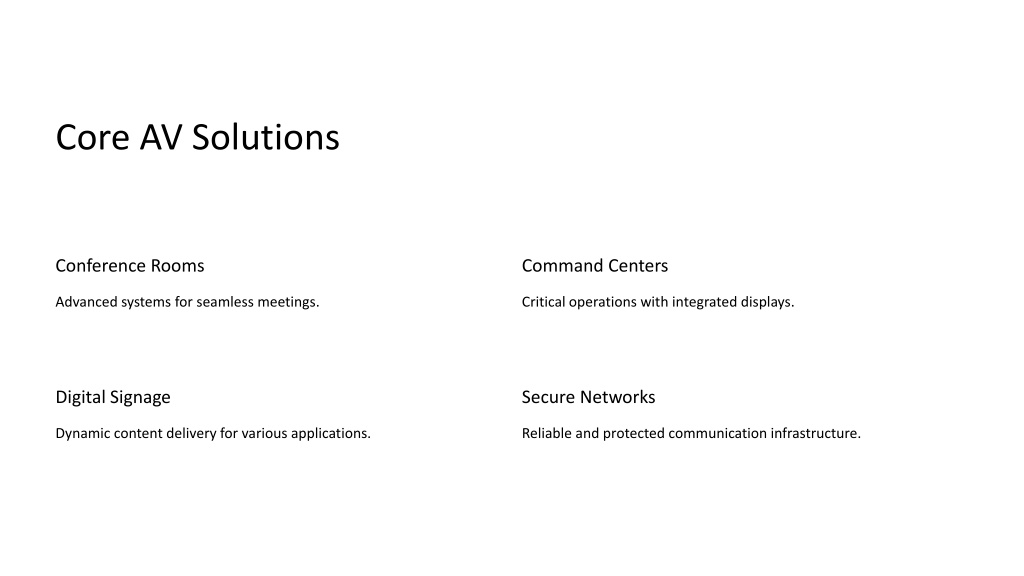 Core AV Solutions Conference Rooms Command Centers Advanced systems for seamless meetings. Critical operations with integrated displays. Digital Signage Secure Networks Dynamic content delivery for various applications. Reliable and protected communication infrastructure.