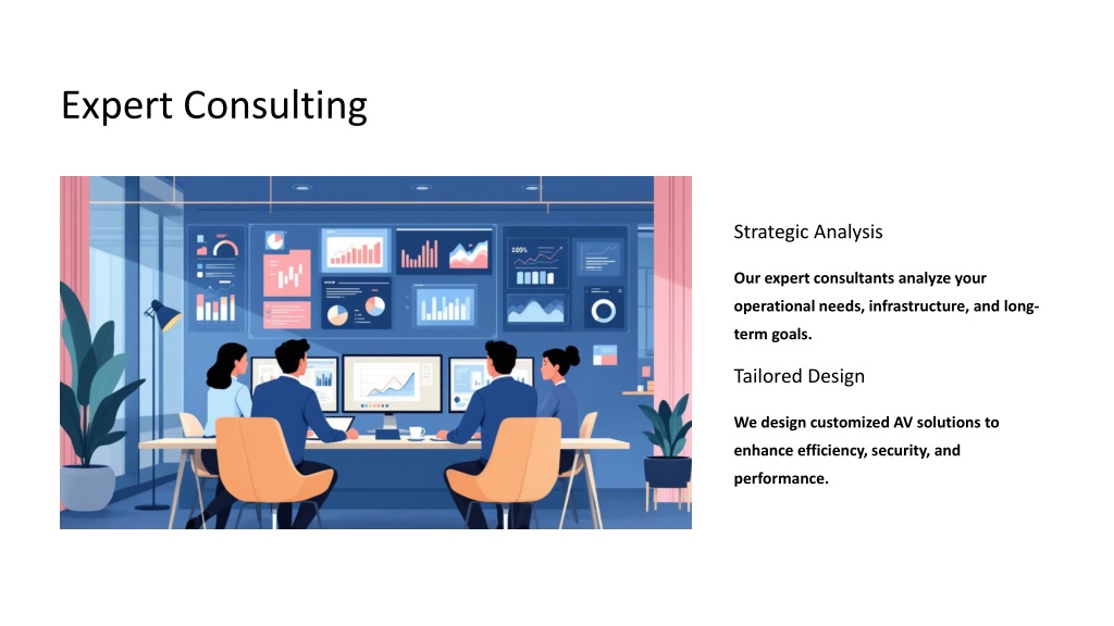 Expert Consulting Strategic Analysis Our expert consultants analyze your operational needs, infrastructure, and long-term goals. Tailored Design We design customized AV solutions to enhance efficiency, security, and performance.