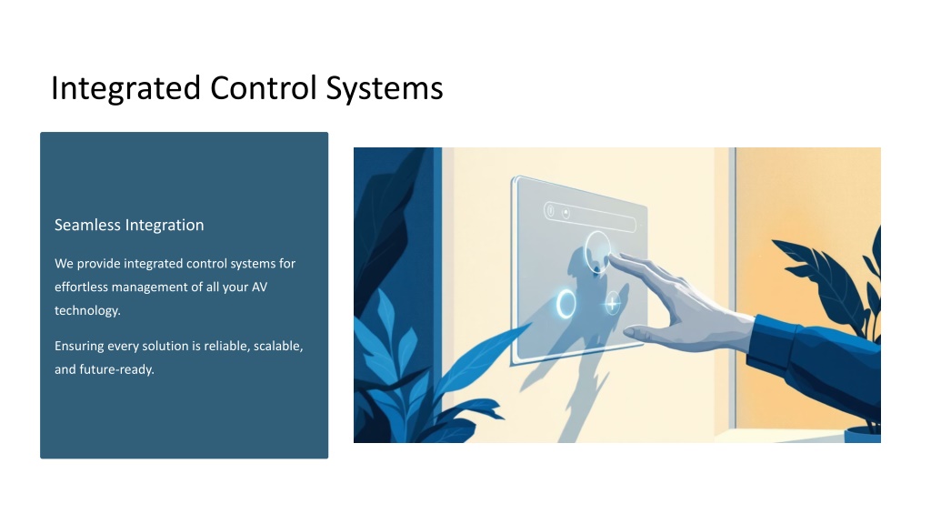Integrated Control Systems Seamless Integration We provide integrated control systems for effortless management of all your AV technology. Ensuring every solution is reliable, scalable, and future-ready.