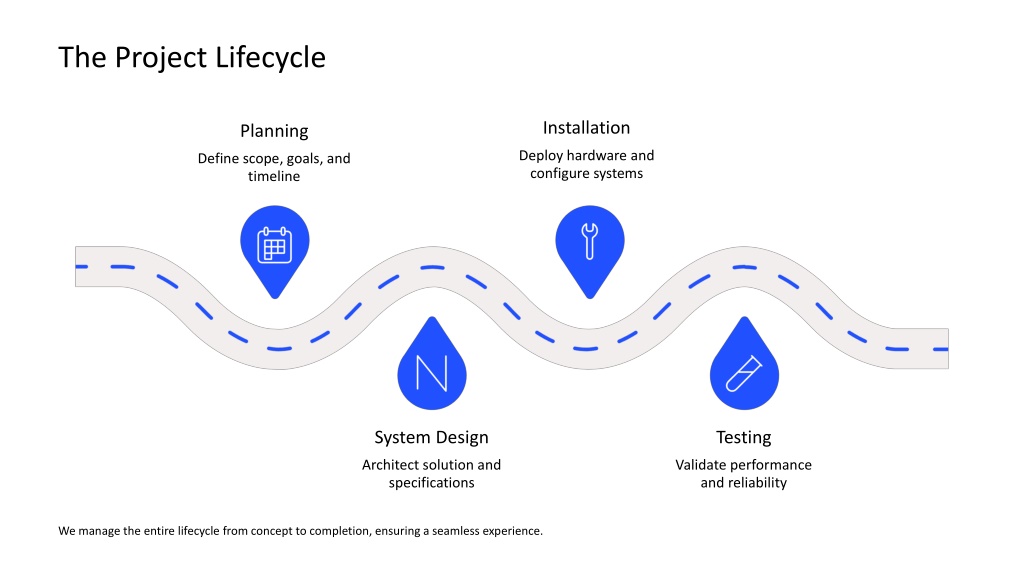 The Project Lifecycle Installation Planning Deploy hardware and configure systems Define scope, goals, and timeline System Design Testing Architect solution and specifications Validate performance and reliability We manage the entire lifecycle from concept to completion, ensuring a seamless experience.