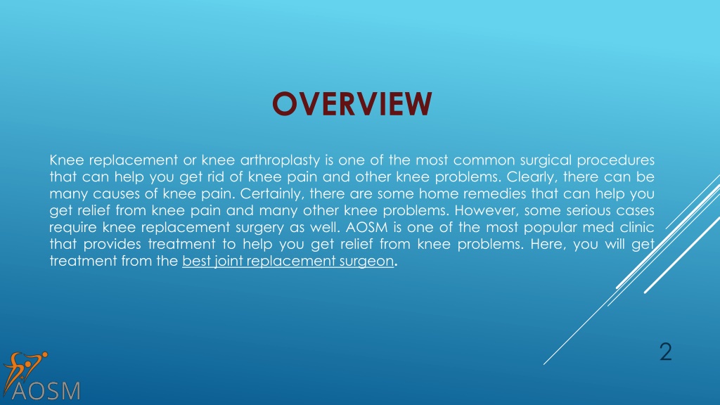 Overview Knee replacement or knee arthroplasty is one of the most common surgical procedures that can help you get rid of knee pain and other knee problems. Clearly, there can be many causes of knee pain. Certainly, there are some home remedies that can help you get relief from knee pain and many other knee problems. However, some serious cases require knee replacement surgery as well. AOSM is one of the most popular med clinic that provides treatment to help you get relief from knee problems. Here, you will get treatment from the best joint replacement surgeon.