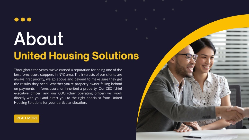 About United Housing Solutions Throughout the years, we've earned a reputation for being one of the best foreclosure stoppers in NYC area. The interests of our clients are always first priority, we go above and beyond to make sure they get the results they need. Whether you’re property owner falling behind on payments, in foreclosure, or inherited a property. Our CEO (chief executive officer) and our COO (chief operating officer) will work directly with you and direct you to the right specialist from United Housing Solutions for your particular situation. READ MORE