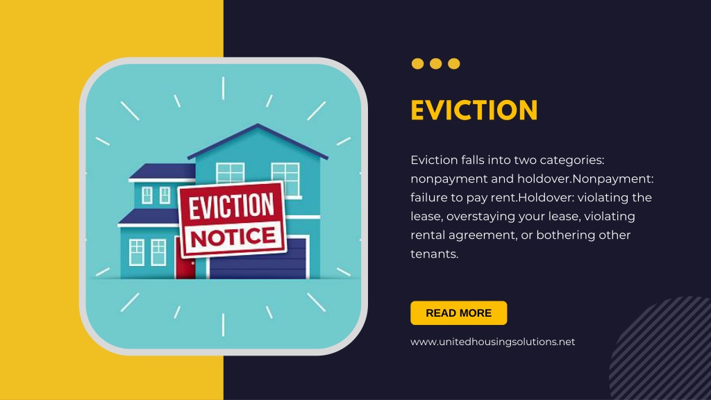 EVICTION Eviction falls into two categories: nonpayment and holdover.Nonpayment: failure to pay rent.Holdover: violating the lease, overstaying your lease, violating rental agreement, or bothering other tenants. READ MORE www.unitedhousingsolutions.net