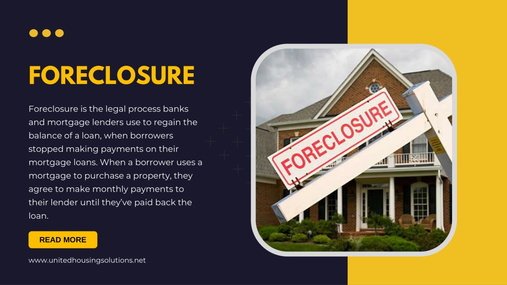 FORECLOSURE Foreclosure is the legal process banks and mortgage lenders use to regain the balance of a loan, when borrowers stopped making payments on their mortgage loans. When a borrower uses a mortgage to purchase a property, they agree to make monthly payments to their lender until they’ve paid back the loan. READ MORE www.unitedhousingsolutions.net