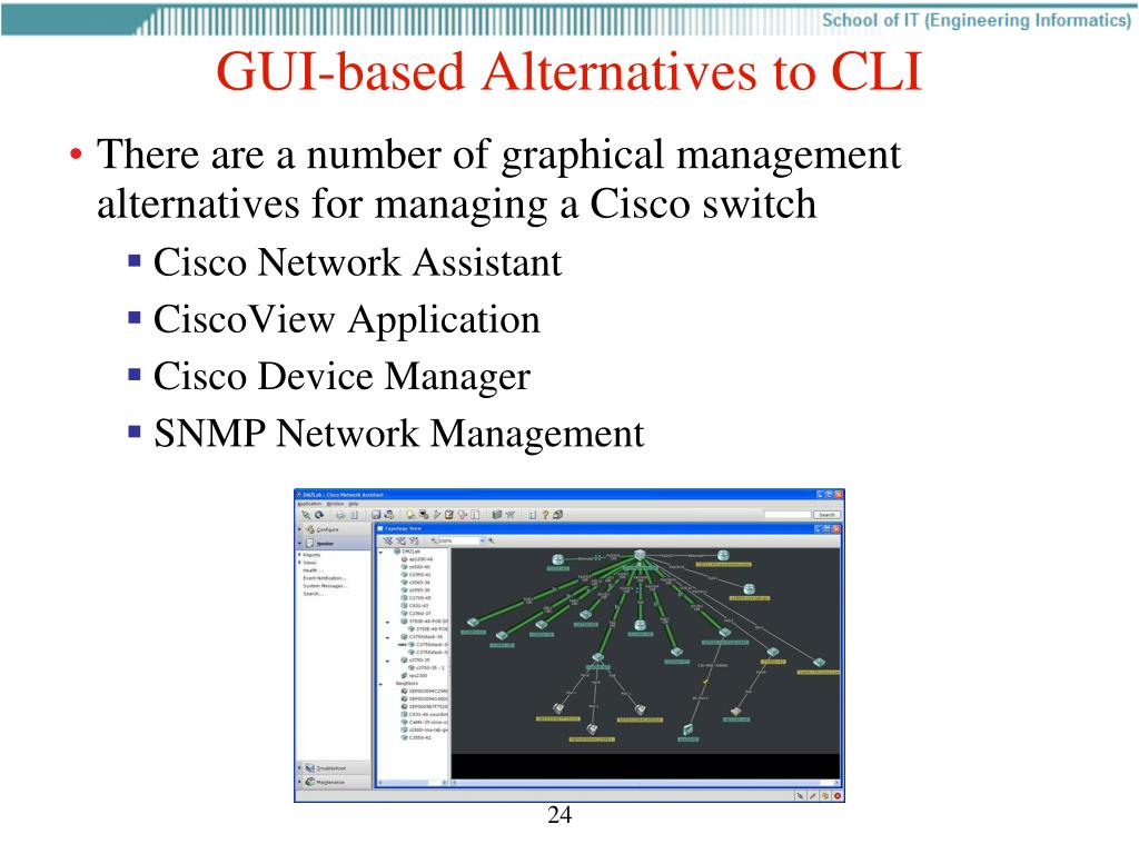 GUI-based Alternatives to CLI • There are a number of graphical management alternatives for managing a Cisco switch • Cisco Network Assistant • CiscoView Application • Cisco Device Manager • SNMP Network Management