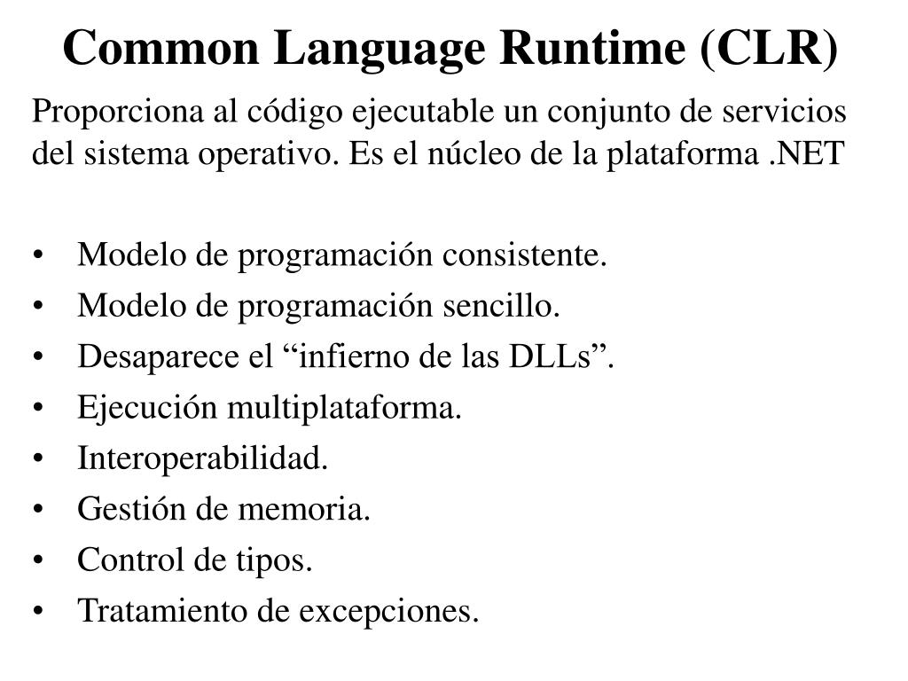 Proporciona al código ejecutable un conjunto de servicios del sistema operativo. Es el núcleo de la plataforma .NET Common Language Runtime (CLR) • Modelo de programación consistente. • Modelo de programación sencillo. • Desaparece el “infierno de las DLLs”. • Ejecución multiplataforma. • Interoperabilidad. • Gestión de memoria. • Control de tipos. • Tratamiento de excepciones.