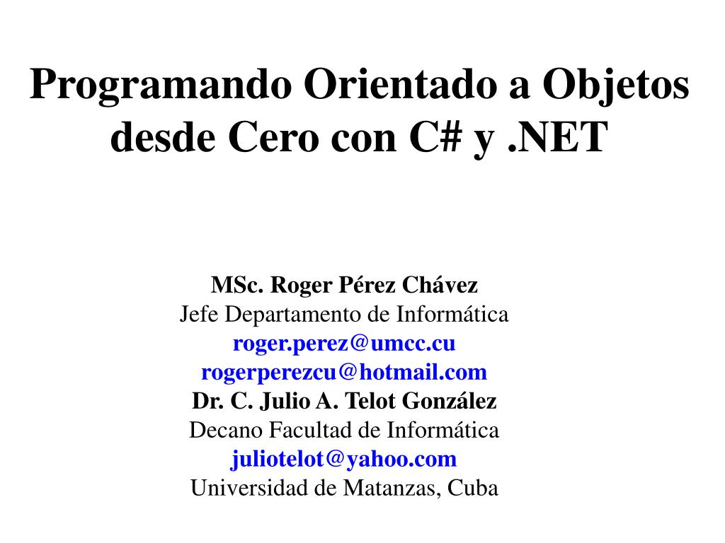 Programando Orientado a Objetos desde Cero con C# y .NET. MSc. Roger P é rez Chávez Jefe Departamento de Informática roger.perez@umcc.cu rogerperezcu@hotmail.com Dr. C. Julio A. Telot González Decano Facultad de Informática juliotelot@yahoo.com Universidad de Matanzas, Cuba.