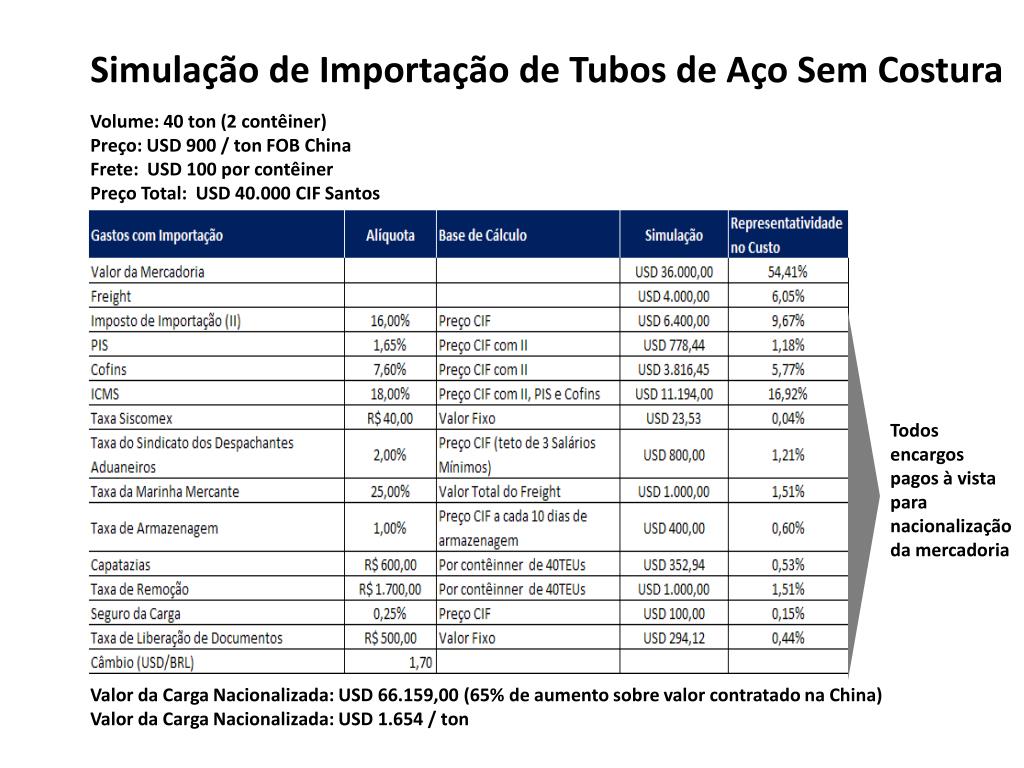 Simulação de Importação de Tubos de Aço Sem Costura Volume: 40 ton (2 contêiner)Preço: USD 900 / ton FOB ChinaFrete: USD 100 por contêinerPreço Total: USD 40.000 CIF Santos Todos encargos pagos à vista para nacionalização da mercadoria Valor da Carga Nacionalizada: USD 66.159,00 (65% de aumento sobre valor contratado na China)Valor da Carga Nacionalizada: USD 1.654 / ton