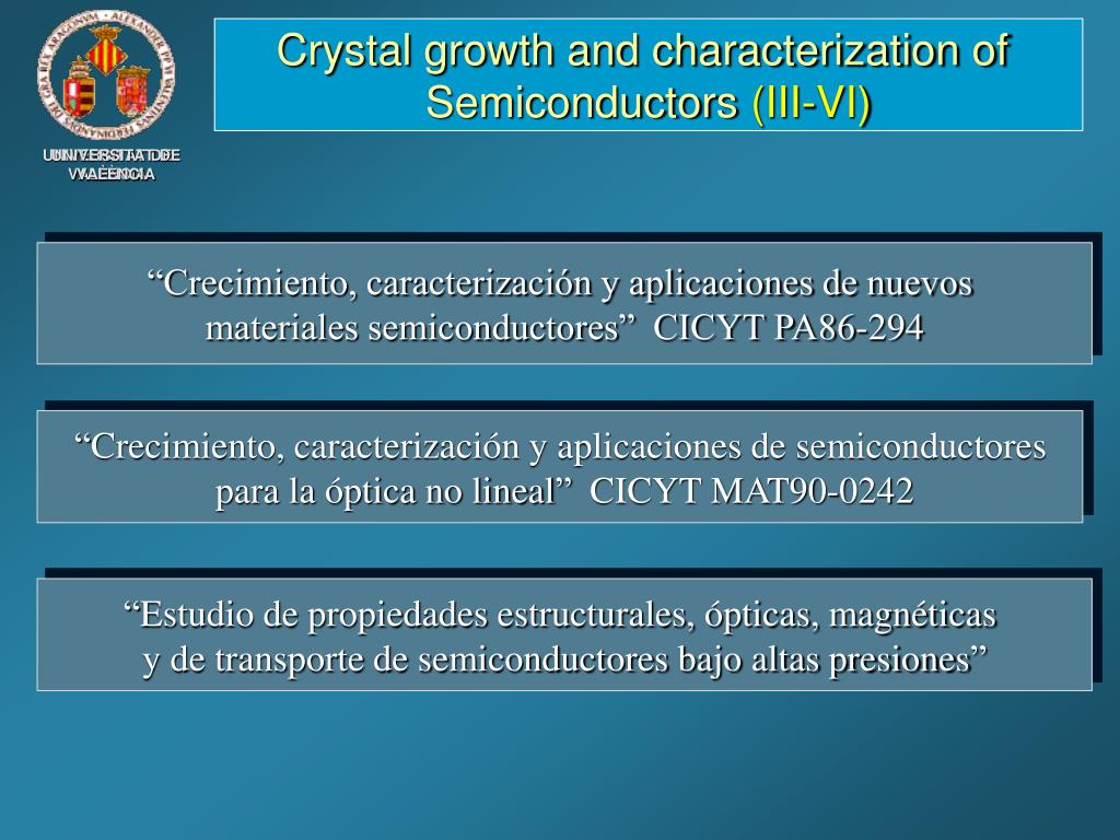 Crystal growth and characterizartion of Semiconductors (III-VI) “Crecimiento cristalino y caracterización de cristales semiconductores II-VI, aleaciones y materiales semimagnéticos IIVI-MnVI” (GV-2005/94) “Crecimiento cristalino caracterización y aplicaciones de compuestos II-VI y aleaciones” (MAT98-0975-C02-01) “Crecimiento de capas epitaxiales de semiconductores II-VI y aleaciones a partir de la pirólisis de compuestos organometálicos MOCVD. Aplicaciones a la fotodetección” (1FD97-0086)